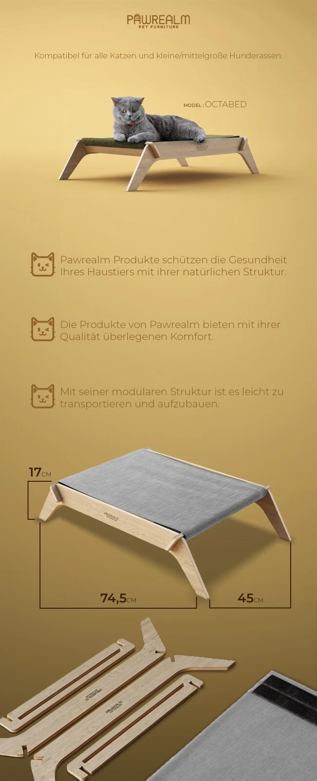 Modulares Katzenbett aus Birkenholz – Natürlich, Bequem, Pflegeleicht Suchen Sie ein praktisches, stilvolles und langlebiges Katzenbett? Das modulare Katzenbett aus Birkenholz bietet alles, was Ihre Katze und Ihr Zuhause brauchen! Ihre Vorteile im Überblick: 100% Natur-Birkenholz – Stabil & stilvoll Modulares Design – Schneller Aufbau & leichter Transport Wasserabweisende Oberfläche – Einfach zu reinigen Duck-Stoff Bezug mit Füllung – Weich & strapazierfähig Flexibel einsetzbar – Passt in jede Wohnung Schnell aufgebaut & vielseitig nutzbar Das Bett wird zerlegt geliefert und ist mit wenigen Handgriffen einsatzbereit. Ideal für Umzüge oder Neugestaltungen. Es passt sich jedem Raum harmonisch an. Hohe Qualität zum fairen Preis Hochwertige Materialien und durchdachtes Design garantieren eine lange Lebensdauer – eine Investition, die sich lohnt. Bieten Sie Ihrer Katze Komfort und Stil – Jetzt kaufen oder Gebot abgeben!