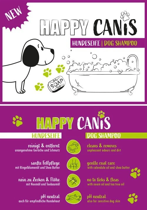 Happy Canis Hundeshampoo entfernt unangenehme Gerüche, Schmutz und Dreck. Ringelblumenöl und Sheabutter sorgen für eine reichhaltige Hautpflege, während Neemöl und Teebaumöl gegen Zecken und Flöhe helfen können. Ph-neutral. Ideal auch für empfindliche Hundehaut.