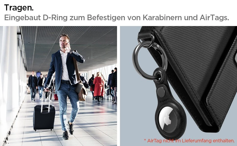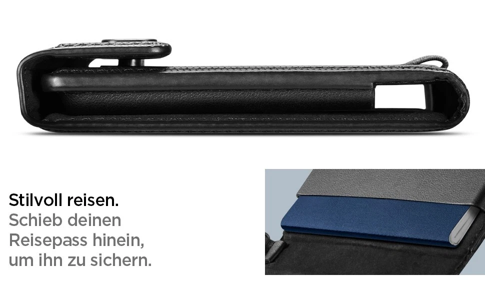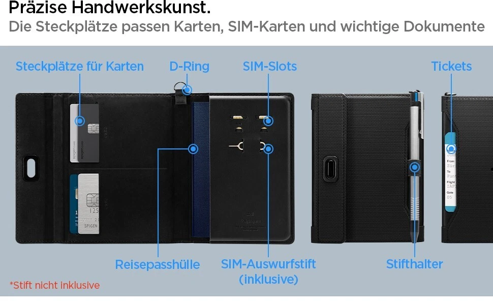 - Kapazität: Platz für 4 Ausweise/Kreditkarten, einen Reisepass, SIM-Karten, einen Stifthalter und eine Bordkarte